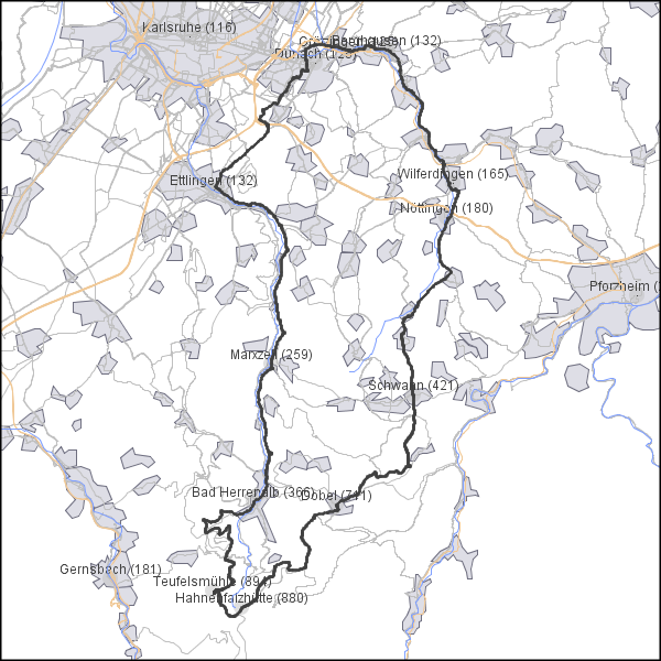 Über Wilferdingen zur Schwanner Warte. Auf dem Rad-Westweg über Dobel zur Teufelsmühle. Zurück durch Bad Herrenalb über den Albtal-Radweg nach Ettlingen. Weiter über Durlach und Grötzingen.